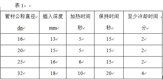 4)從現(xiàn)在開(kāi)始即進(jìn)入加熱時(shí)間,并加熱至表1中規(guī)定的時(shí)間。規(guī)定的加熱時(shí)間到達(dá)后,從加熱模頭上拔出管材和管件,拔出速度應(yīng)適中,不能過(guò)急,但可以略帶輕微的抖動(dòng)動(dòng)作,以利于拔出。