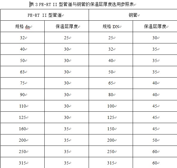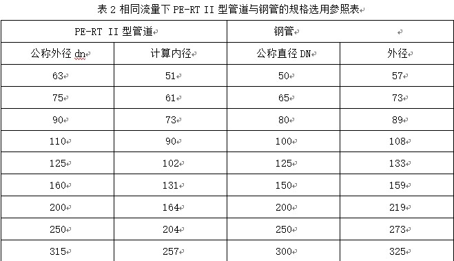 與鋼管比較,PE-RT II型管道的摩擦阻力小,同樣內(nèi)徑的管材流量是鋼管的1.25倍,隨著鋼管的腐蝕,內(nèi)壁會變得更加粗糙,流量也會逐年降低,相同流量的情況下,PE-RT II型管道與鋼管的規(guī)格選型見表2